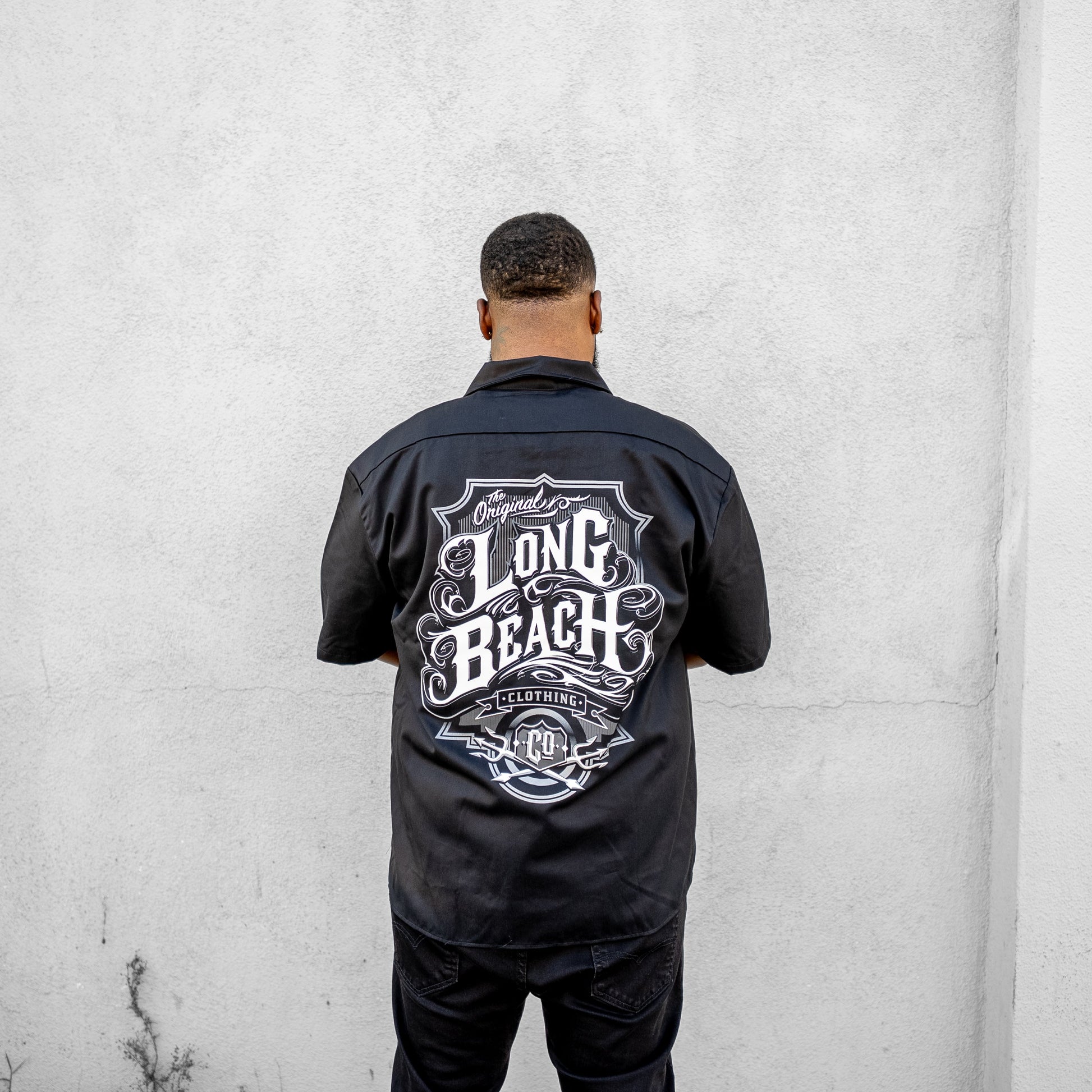 Our Long Beach Oil Can men's work shirt features a bold design on the back with "The Original" printed above the front left pocket on a super durable Dickies short sleeve botton down. Work shirts also includes our "Cursive LB" clip label on the sleeve and Dickies patch on the bottom of placket.