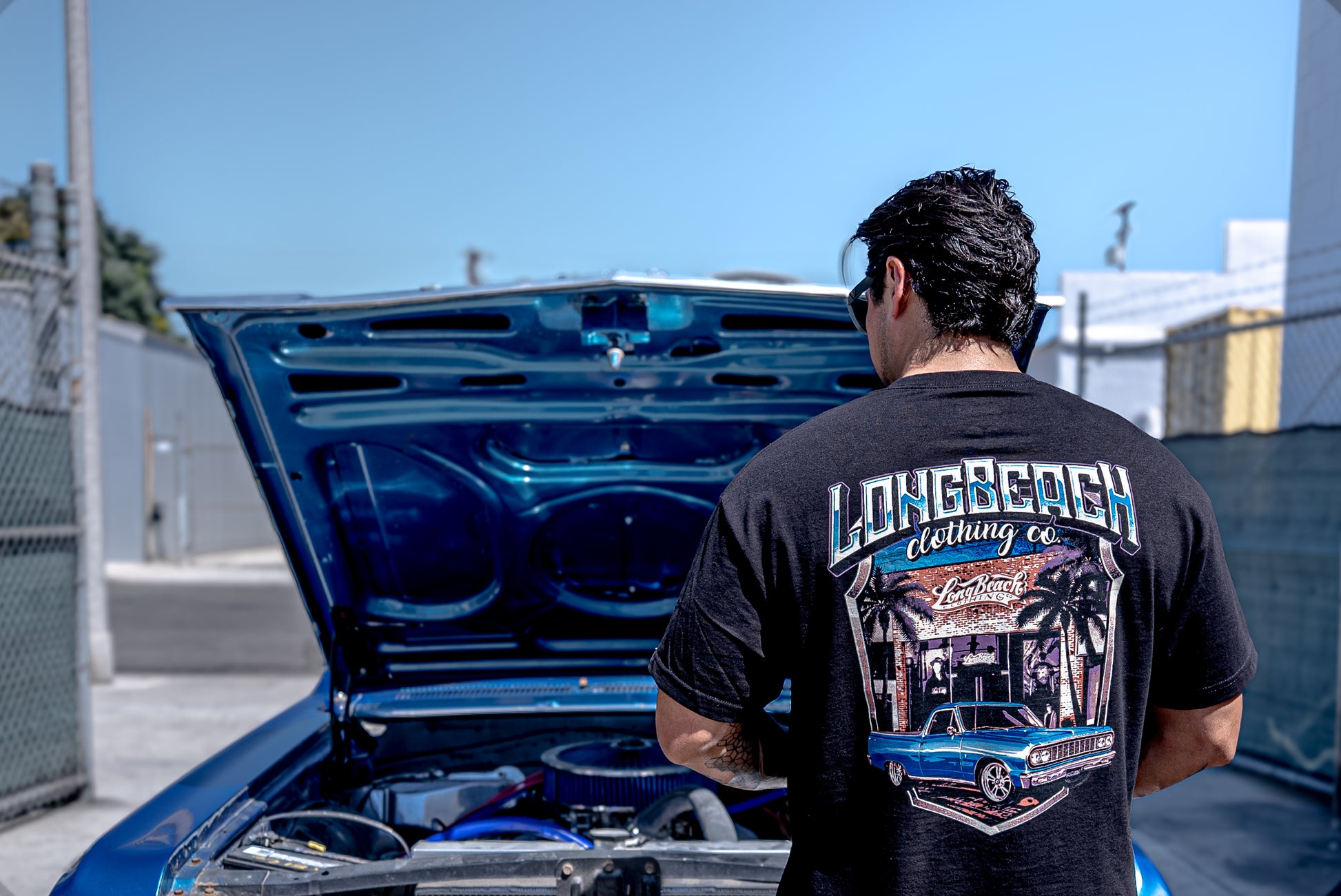 For all those classic car lovers, this new design features our owner's 1964 blue ELCO in front of our Belmont Shore retail store. Wear with Long Beach pride.