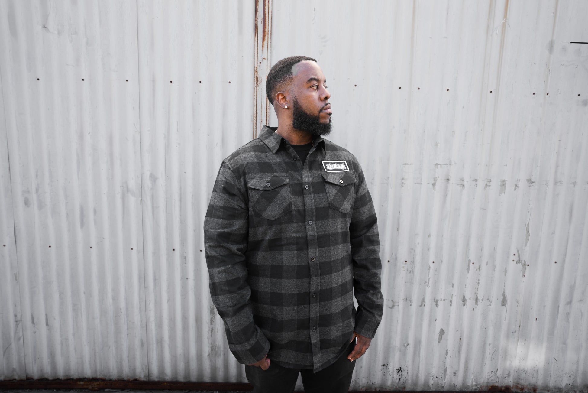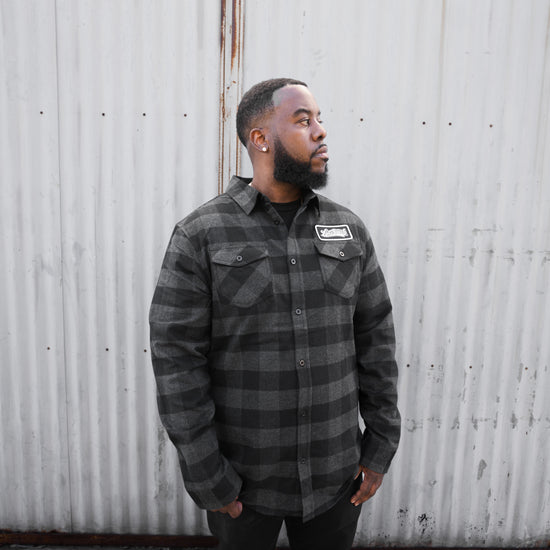 Represent Long Beach in our men's charcoal heather & black flannel button up long sleeve shirt.
